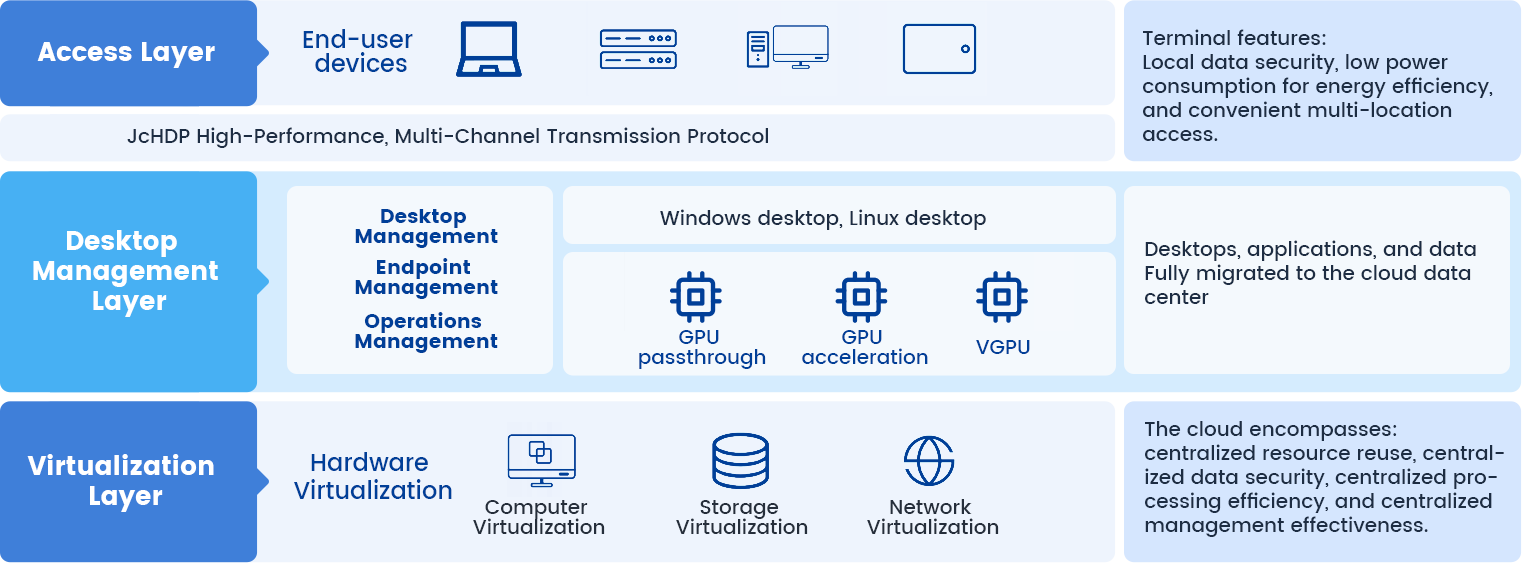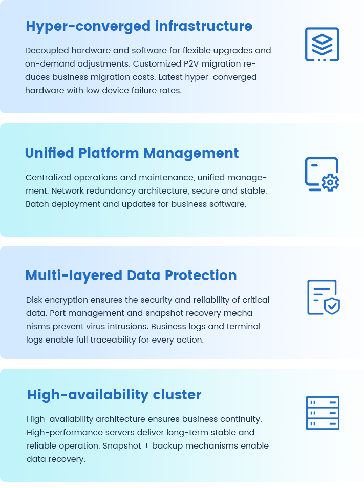 Juchen Industrial Cloud Desktop Software (referred to as “Juchen DT”) is a domestically developed desktop virtualization system designed for industrial environments. It delivers comprehensive stability, reliability, high availability, and high performance.